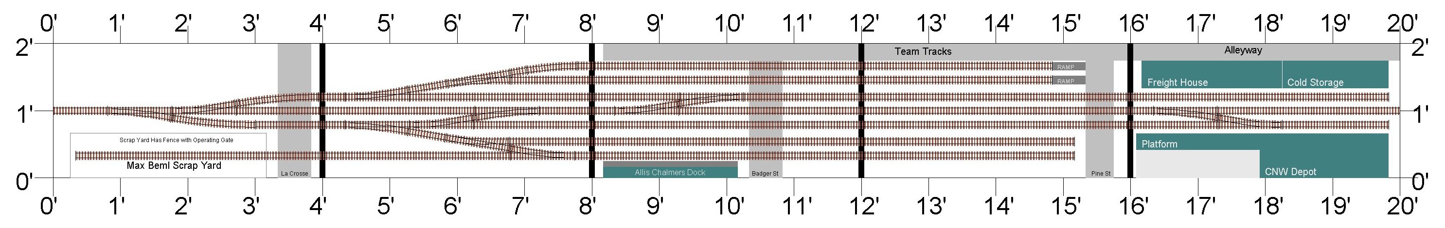 The above is the proposed track plan for the module. This closely resembles the prototype except for moving La Crosse St. further up the yard throat and removing the crossovers to the left of Pine St. This then provides a full 10' runaround for incoming trains. I also extended the center track to the end of the module so if needed this module could have modules connected at both ends.